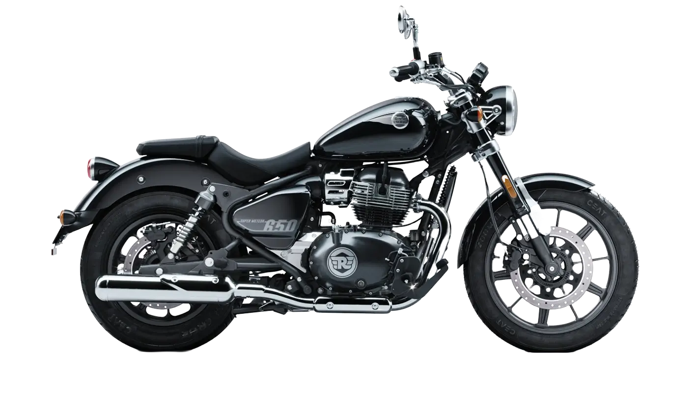 Draped in Astral Black, the Super Meteor 650 projects a timeless cruiser silhouette with a dark, brooding presence. The deep matte/metallic black finish accentuates its clean lines, contrasting chrome details, and muscular fuel tank, while the LED headlamp and inverted front fork give it a modern edge. The Astral variant emphasizes the core cruiser experience without too many touring add-ons — perfect for those who prefer sleek, no-frills cruising. Under the skin lies the proven 648 cc parallel-twin engine, a 6-speed gearbox, LED lighting, USD fork upfront, dual shocks at the rear, and full dual-channel ABS. The Super Meteor in Astral Black blends classic cruiser vibe with modern tech and dependable mechanicals for Kolkata’s rider.